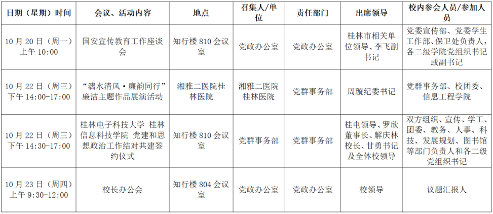 2025年秋季学期第八周(10月20日-10月24日)全校性会议活动安排表