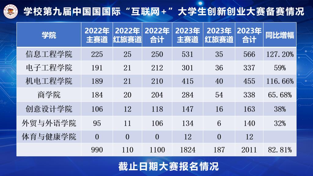 自本届大赛开赛以来,学校领导高度重视,召开专题会议研究部署,整合校内资源、明确责任分工;二级学院认真选拔、全力备赛;双创学院积极协调、精心组织,先后举办了第九届“互联网+”校内选拔赛,第九届“互联网+”大赛参赛解读讲座,校内“金种子”训练营11期,对参赛项目进行优化,提升参赛水平,提高项目参赛质量。在各单位的共同努力下,学校今年共计2046个项目报名参赛,其中高教主赛道1824项,“青年红色筑梦之旅”赛道187项,产业赛道35项,报名数量同比去年增幅85%,产业赛道更是实现了“从无到有”,“从有到优”的过程,经过二级学院推荐、校赛的层层选拔,共有37个项目入围区赛网评,入围数量同比增幅60%。下一步,学校将以“互联网+”大赛为载体深化学校双创教育改革,多渠道引入优质资源,将创新创业教育融入学校人才培养全过程,通过优化课程建设、丰富实践活动、深化培训培育,不断完善双创教育体系,努力提升广大师生创新创业能力。