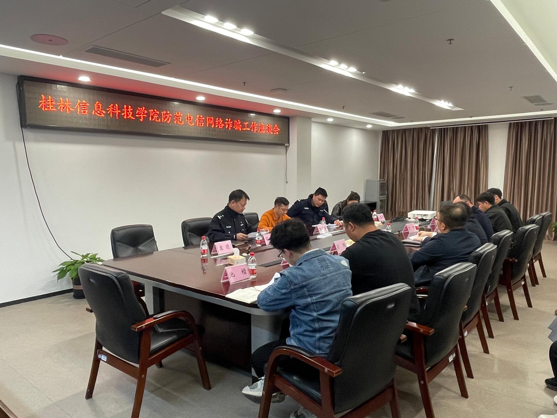为维护校园和谐稳定,预防、减少电信诈骗案件发生,提高师生防范网络电信诈骗能力,合力构建“无诈校园”,筑牢校园网络安全防护屏障。3月21日,我校在804会议室召开防范电信网络诈骗工作推进会,临桂区委政法委副书记唐爱华,桂林市公安局临桂分局常务副局长经绎,桂林市公安局庙岭派出所所长邓明明,桂林市公安局临桂分局反诈中心毛胜荣,学校纪委书记、校长助理周璇,校长助理彭鹏,保卫处副处长罗光铭及各学院党委书记、辅导员代表参加会议。
