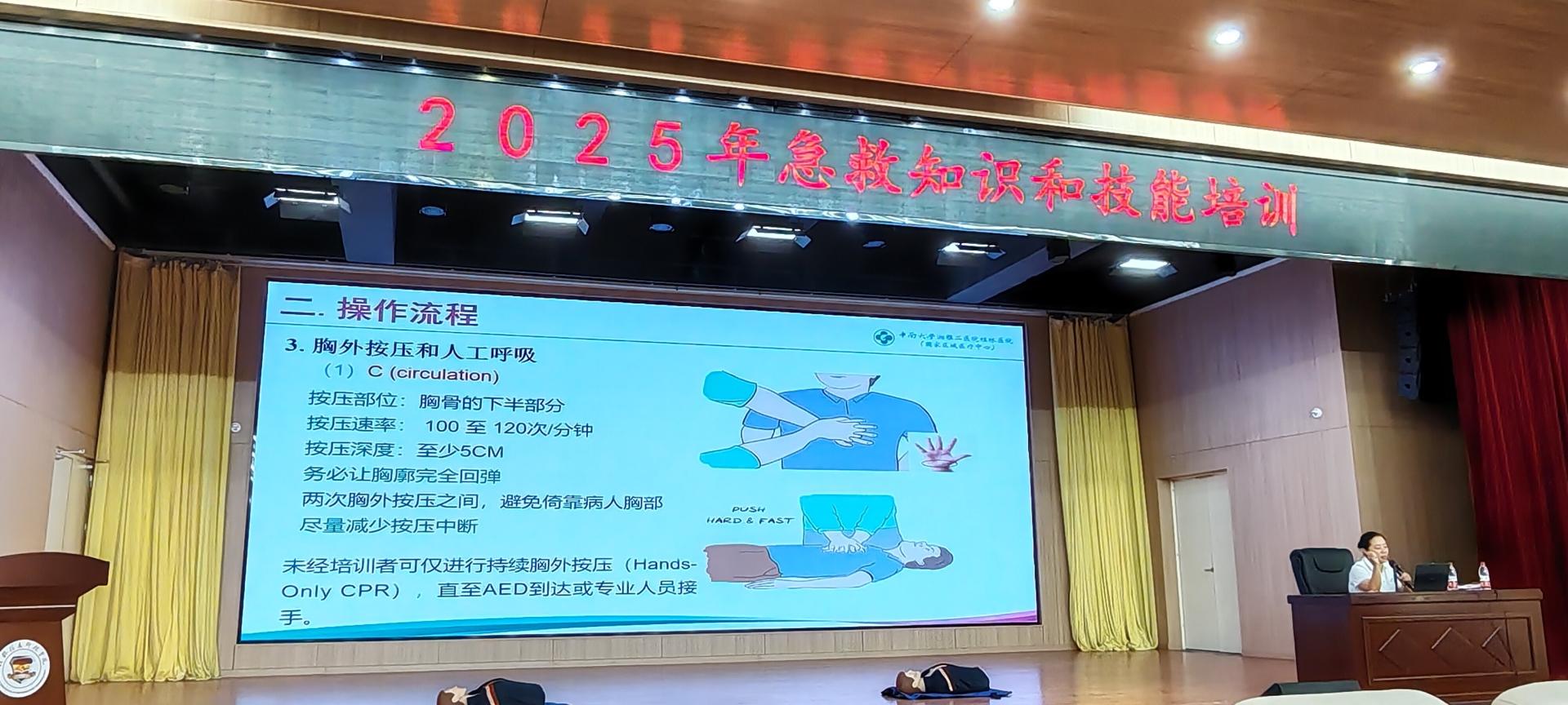 为进一步普及校园急救知识,提高医务人员急救处置能力和教职员工自救互救能力,学校于7月22日邀请湘雅二院急诊科谢杉杉主任到校开展主题为“急救知识进校园,安全守护零距离”的急救知识专题培训,全体医务人员、学校辅导员、宿舍管理员、保安人员共计200余人参加。
