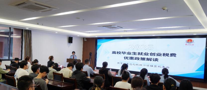 随着毕业季来临,为帮助即将步入职场的应届毕业生顺利转换角色、了解基本税务知识,2025年4月18日上午,桂林市临桂区税务局第一税务分局应我校财务处邀请,在知行楼818会议室为2025届毕业生举办了一场别开生面的毕业生就业创业税费优惠政策宣讲会。
