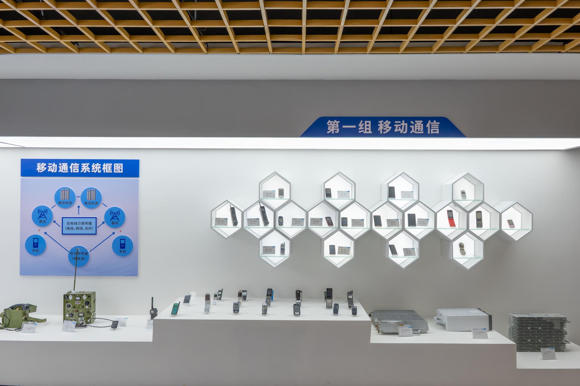 “移动通信系统框图”,它清晰勾勒出移动通信系统的基本架构与运行原理。从基站的信号发射与接收,到手机等终端设备的通信连接,每一个环节都紧密相连、至关重要,共同构筑起我们如今便捷高效的移动通信网络。墙面蜂窝造型的展示区里,陈列着不同时期的手机,它们是移动通信技术飞速发展的见证者 —— 从早期笨重、功能单一的大哥大,到如今轻薄智能、集多种功能于一身的现代手机,外形与功能的演变不仅彰显着科技的进步,更深刻改变了我们的生活方式。展台上的各类通信设备,在不同历史阶段为通信网络的搭建与运行提供了坚实支撑,见证了通信从模拟信号到数字信号、从 2G、3G 到 4G、5G 的伟大跨越。