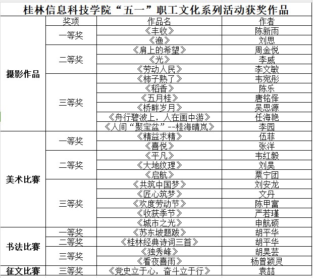 为全面学习贯彻党的二十大精神和中国工会十八大精神,响应桂林市总工会以“中国梦•劳动美”为主题的2024年桂林市庆“五一”职工文化系列活动,桂林信息科技学院开展职工书法、美术、摄影和主题征文比赛。本次活动得到了全校教职工的积极响应,共征集到书法、美术、摄影作品80余件,经评审,共遴选出26余件作品参展,其中9件作品报送桂林市总工会比赛。