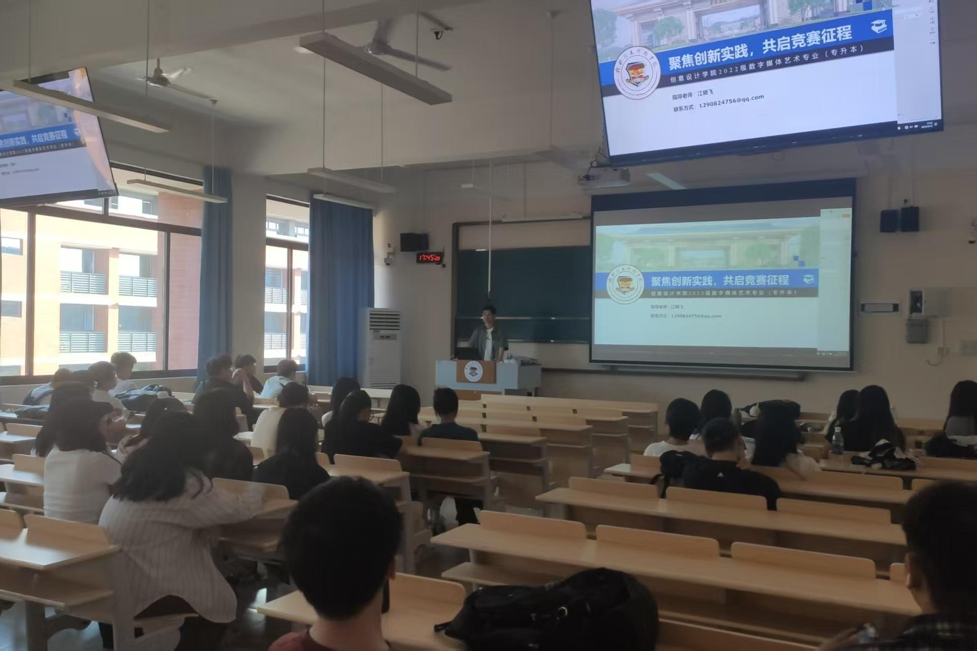 5月14日下午,2022级数字媒体艺术专升本班在 D406 教室召开“聚焦创新实践,共启竞赛征程”主题班会。班主任江晓飞老师围绕学科竞赛与校企合作实践展开专题分享,为班级全体学生搭建创新创业知识桥梁。