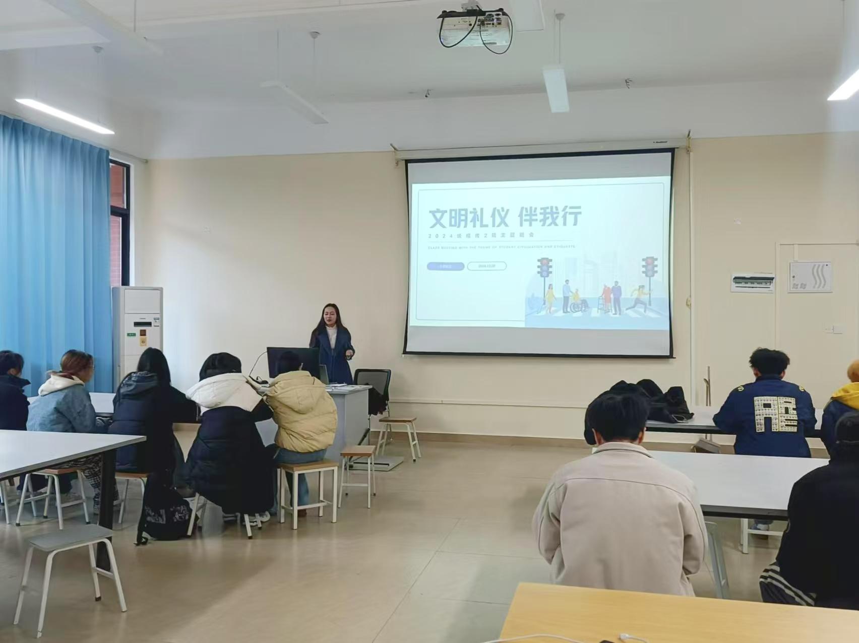 2024年12月18日,2024级视觉传达设计2班在德远楼E413教室成功举办了一场以“文明礼仪伴我行”为主题的班会活动。本次班会由学业导师兼班主任伍红霞老师主持,全班同学积极参与,现场气氛热烈而温馨。