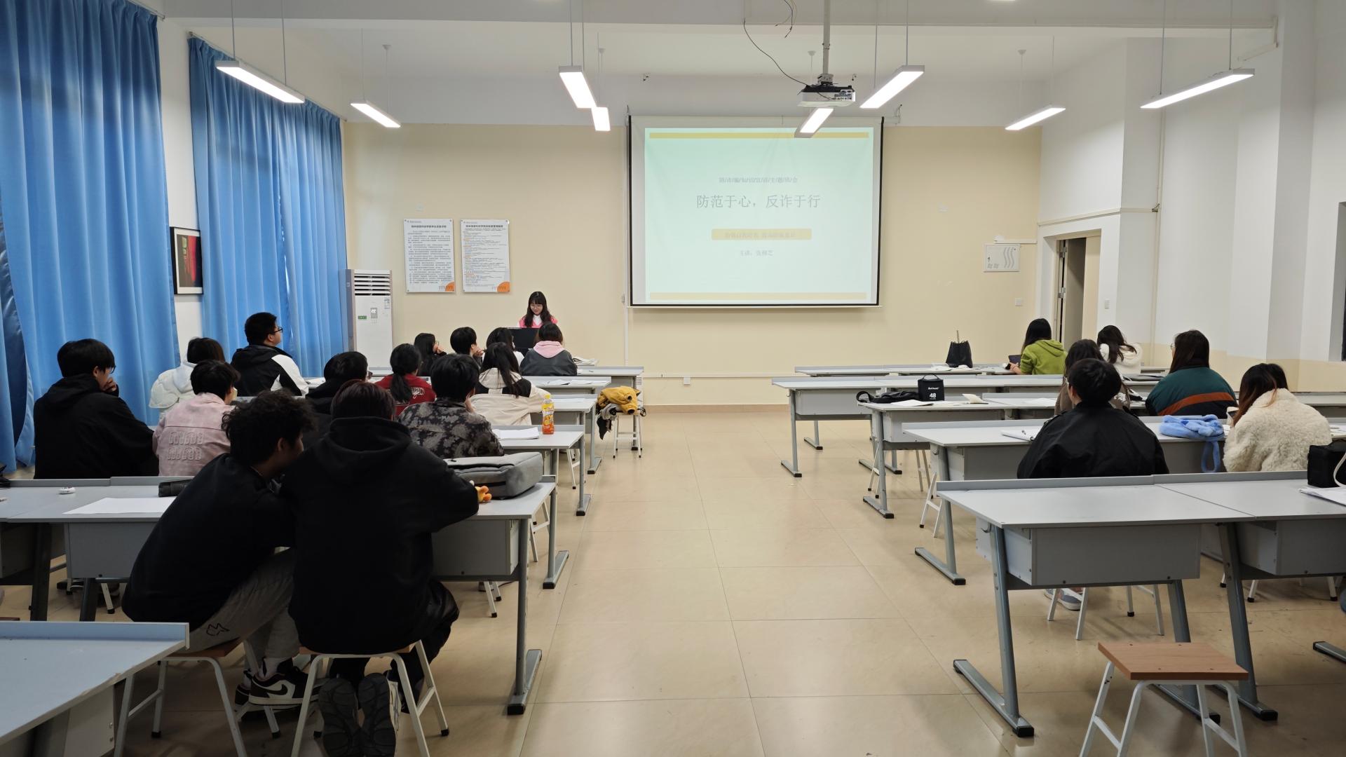 在会议中张老师进行了诈骗案例分享,通过真实案例的分析,让学生了解网络诈骗的多样性和隐蔽性,包括冒充客服、钓鱼网站、虚假购物等常见手段。并且老师进行了防范技巧的讲解,向学生传授识别和防范网络诈骗的基本技巧,如不轻信陌生信息、不随意透露个人信息、使用安全的网络连接等。