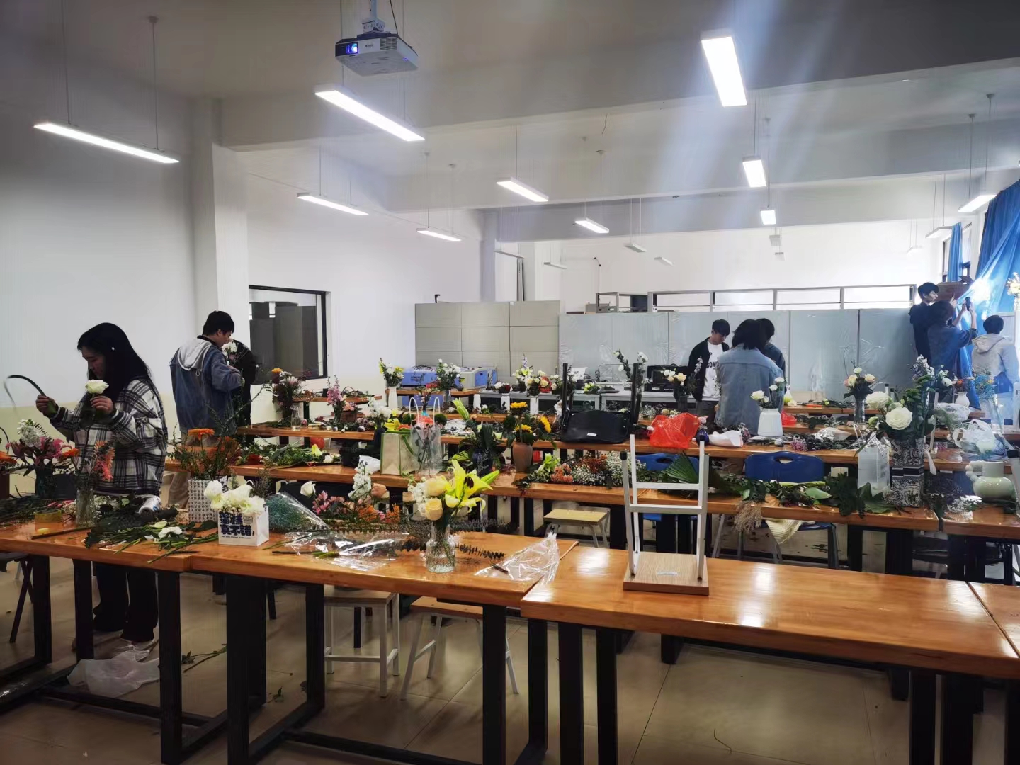 此次课程旨在让学生们感受到花艺的魅力,培养他们的艺术创作能力。在课堂上,石欣蕾老师详细讲解了插花的基本手法和技巧,以及东西方花艺在审美观念、创作风格等方面的差异。学生们认真聆听,热情高涨,纷纷动手实践,将所学知识运用到实际的插花过程中。