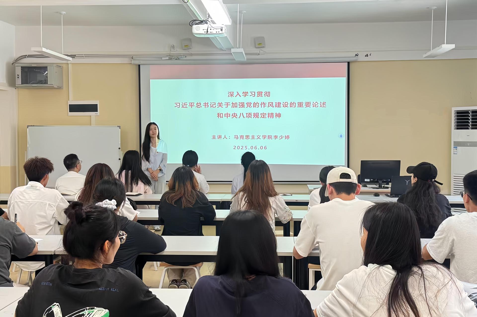 为传达上级关于深入贯彻中央八项规定精神学习教育工作文件精神,专题学习习近平总书记关于加强党的作风建设的重要论述,马克思主义学院理论宣讲团成员李少婷同志于2025年6月3日,受邀到创意设计学院第一学生党支部开展“党的创新理论进基层”活动。