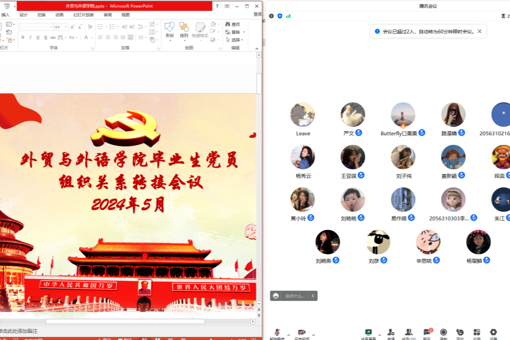 为了提高毕业生党员对党组织关系转接的认识,规范党组织关系转接工作流程,确保我院毕业生党员顺利完成党组织关系转接,外贸与外语学院于5月21日召开了2024届毕业生党员组织关系转接注意事项线上培训会议。会议邀请了外贸与外语学院党总支书记李刚、学院组织员以及全体2024届毕业生党员参会。
