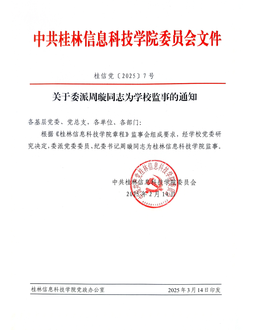 关于委派周璇同志为学校监事的通知
