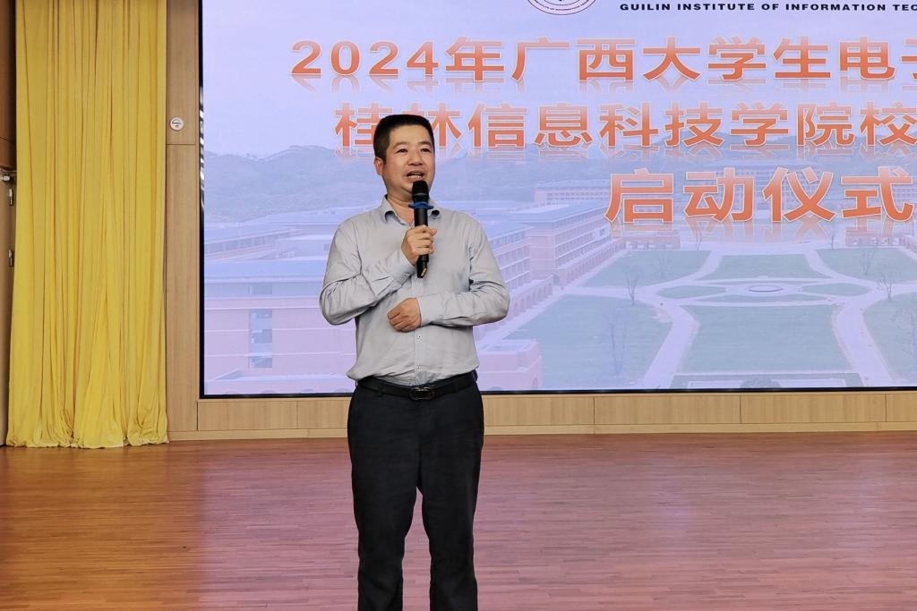 仪式上,韩剑首先向同学们介绍了全国大学生电子设计竞赛我校历年获奖情况。接着,韩剑指出,电子设计竞赛旨在促进电子信息类专业和课程建设,加强大学生创新能力、动手能力、工程实践能力和团队协作精神的培养,希望同学们积极参加竞赛,以赛促学,以赛促练。随后,韩剑宣布广西大学生电子设计竞赛桂林信息科技学院校内选拔赛正式启动。