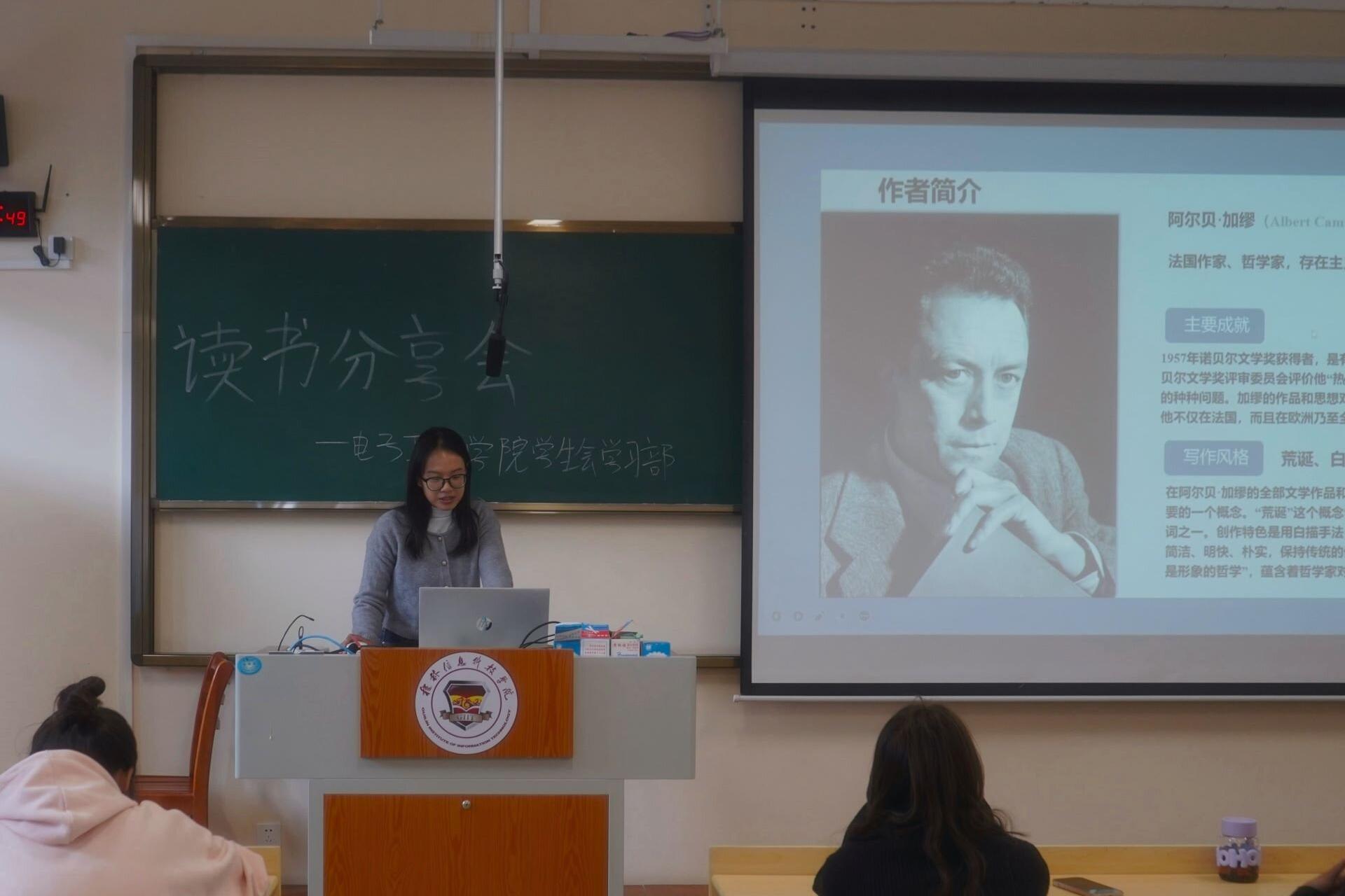 会上,同学们依次分享了《呐喊》《红楼梦》《解密》《活着》等九本书籍,并阐述了自己选择这本书的原因,将书中的故事和人物生动展示出来,并表达自己的感悟。随后,蒋仲琴老师与同学们分享了她对加缪的《局外人》的阅读心得。在分享中,蒋老师向同学们介绍了《局外人》这本书的风格及其哲学内涵,还与同学们一起探讨书中关于自由与责任、情感与理性等话题,引发了在场听众的深刻共鸣。