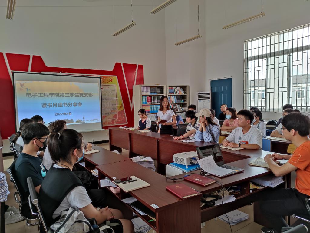 为推进学习型党组织建设,激发党员学习积极性,努力营造爱读书、读好书、善读书的良好氛围,4月26日,电子工程学院第三学生党支部开展以“多读书、读好书、好读书”主题读书分享会,会议由支部书记欧盛福主持,支部全体在校党员参加会议。