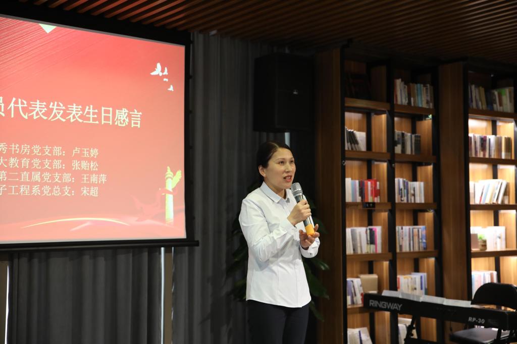 在发表生日感言环节中,独秀书房党支部代表卢玉婷老师提到会时刻牢记入党时的誓言,广大教育党支部张贻松老师是在场党龄最长的党员,他认为党龄只是一个数字,鼓励年轻学生积极向党组织靠近,我院机关第二直属党支部王南萍老师分享了做为一名从事党务工作多年的党员老师在工作上的心路历程,同时说到这次政治生日是她最难忘的一次。