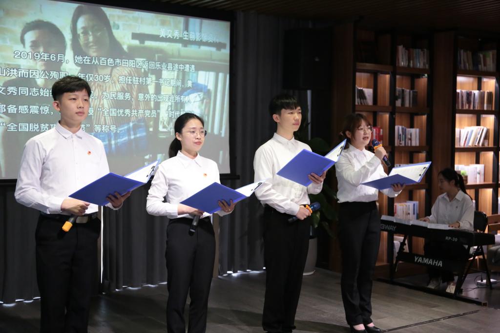 党日活动以经典诵读为载体,各支部党员同志及学生代表通过《少年中国说》、《湘江之歌》、《秀美人生》和《有一首歌》四个朗诵节目,共同回顾百年光辉历程,从中汲取精神营养、坚定理想信念。此外,还穿插了“政治生日”纪念的环节,一同为广西师范大学出版社集团及我院过政治生日的党员庆生,并重温了入党誓词。