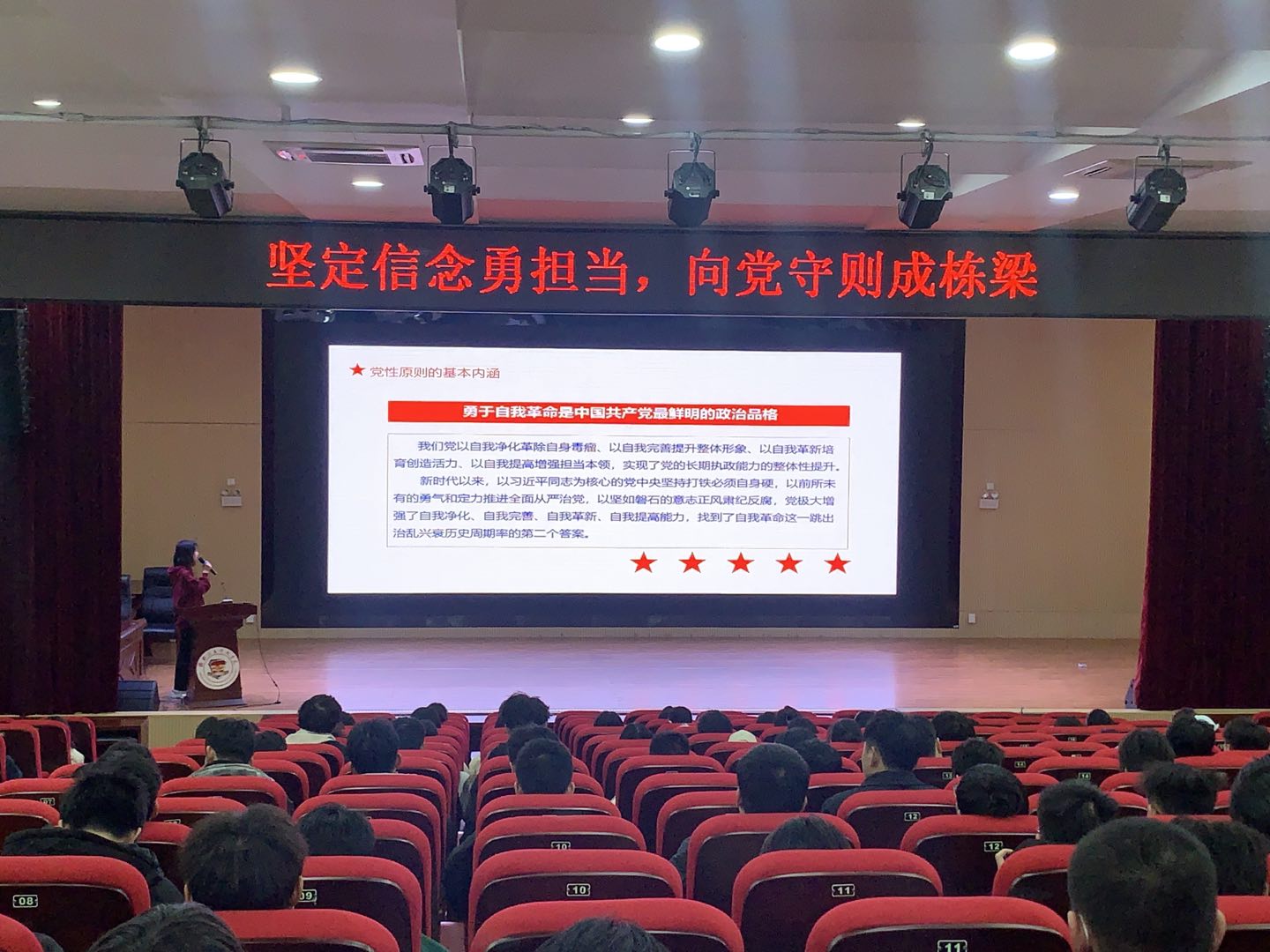 活动期间,主持人为同学们介绍本次团课的主题、背景及活动的意义。讲解完毕,在场的观众一起观看纪录片《永远吹冲锋号》第一集《第二个答案》,该片用一个个活生生的案例彰显了我们党勇于自我革命的政治品格,展现了新时代全面从严治党的伟大实践,释放了反腐败斗争一刻不停、永远吹冲锋号的强烈信号。通过观看专题片让同学们接受了一次深刻的思想洗礼,初心易得,始终难守,要以案为鉴,从反面案例中汲取教训,时刻自律自省,时刻警钟长鸣。积极引导同学们树立报效祖国、服务人民的理想信念。