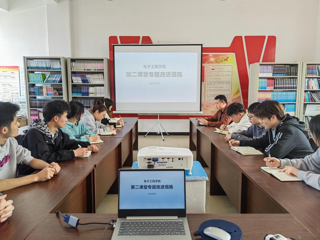 3月2日中午,电子工程学院在41502活动室召开第二课堂专题改进措施交流会。会议由学院分团委书记范恒祯主持,学院分团委副书记、学生会主席团、学院第二课堂中心成员参加本次会议。