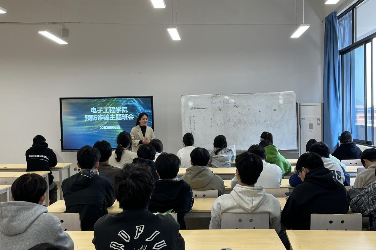 近日,为提高同学们的防诈骗意识,电子工程学院于敦明楼A514举办了以“预防诈骗、警钟长鸣”为主题的班会。本次班会活动邀请了各班班主任为同学们讲解当前诈骗的常见手段及预防措施。