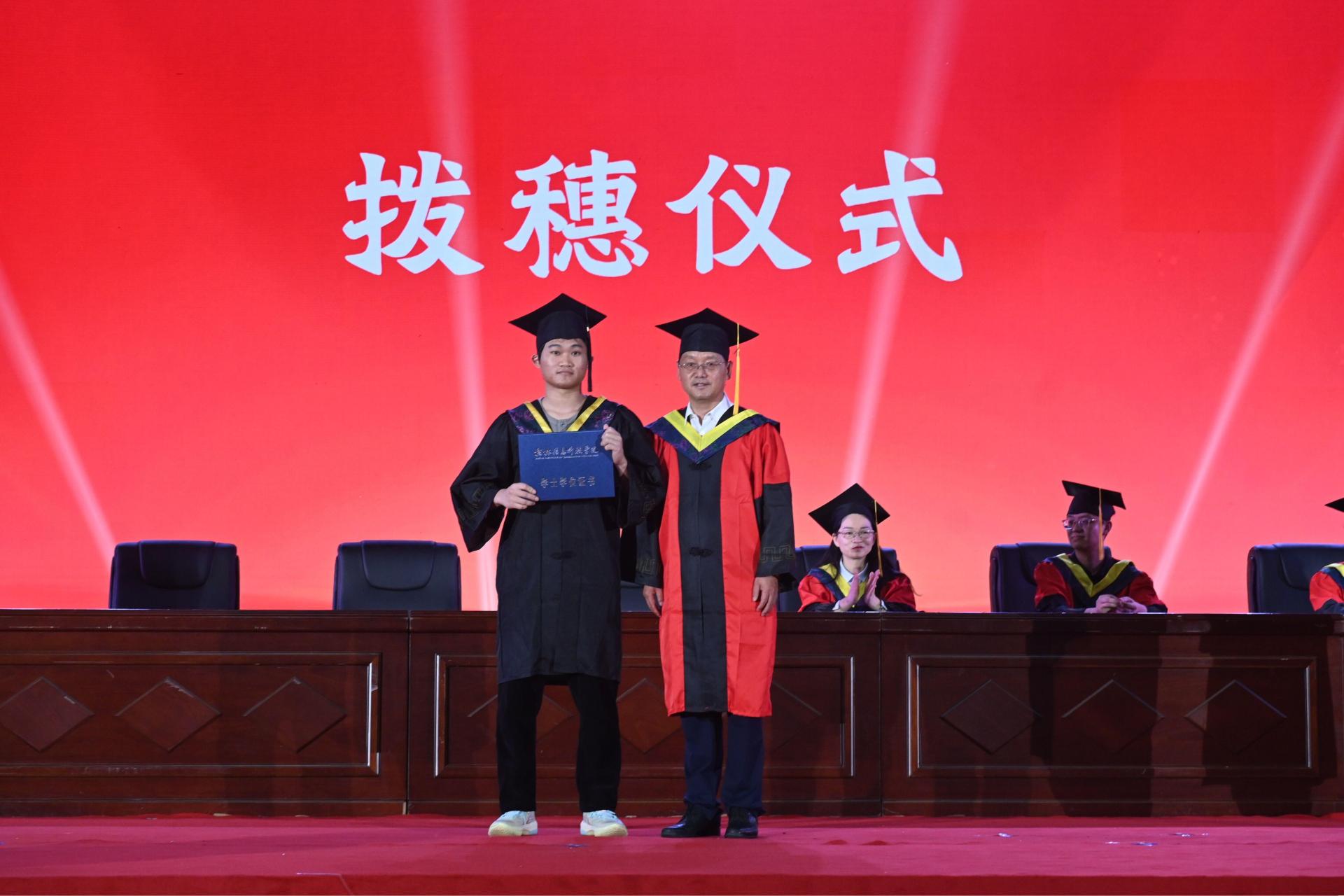 典礼在庄严的国歌声中拉开帷幕。副院长赵志鹏宣读2025届毕业生及学士学位获得者名单,在热烈的掌声和激昂的乐曲声中,身着学位服的毕业生们依次有序走上主席台。院长王东云、副院长赵志鹏、院长助理梁晓梅为毕业生们一一拨正流苏、颁发学位证书并合影留念。庄严的拨穗礼,象征着学子们学有所成,即将展翅高飞。