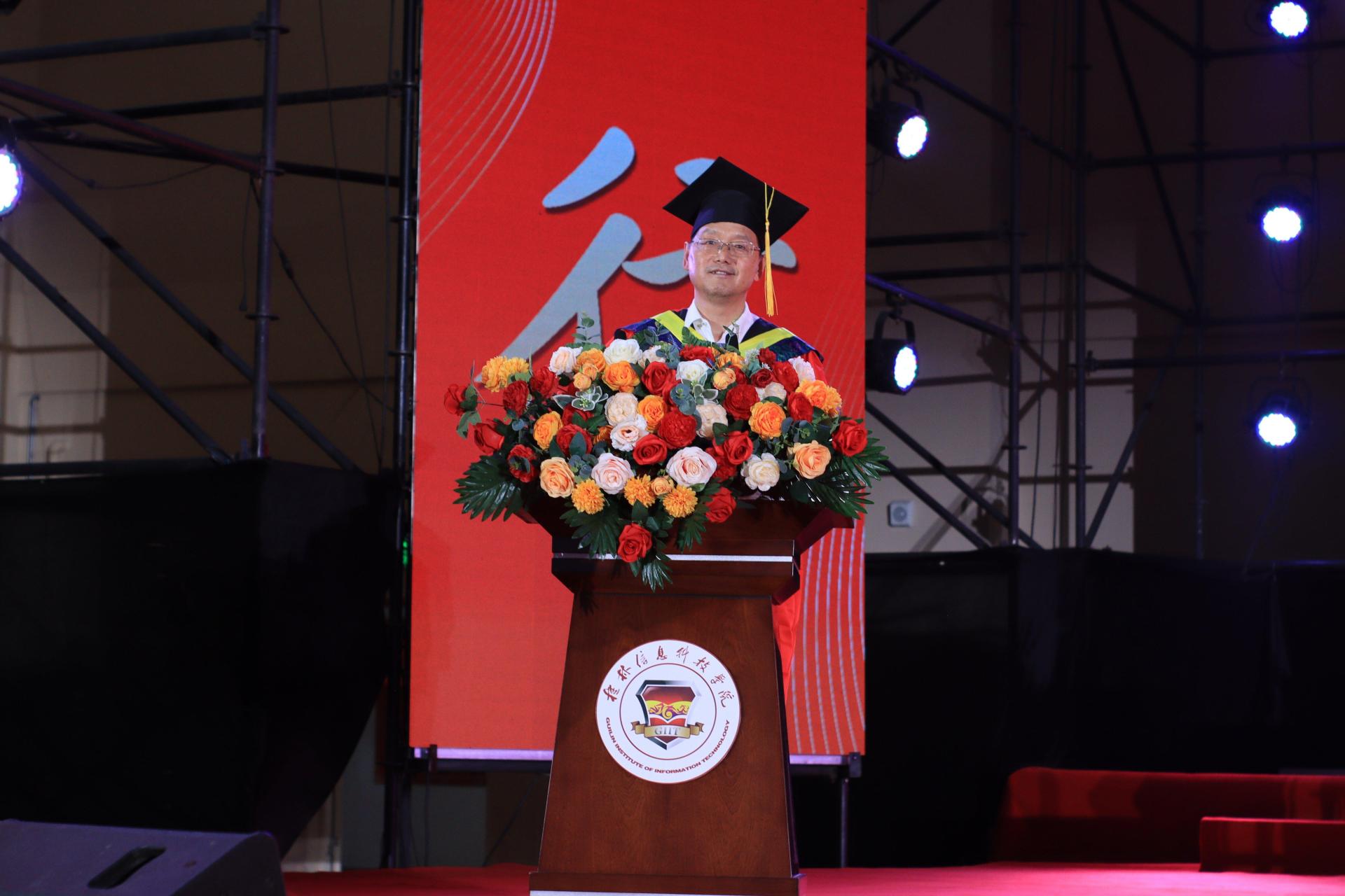 院长王东云代表学院进行致辞。他向圆满完成学业的毕业生们表示最热烈的祝贺,并向辛勤培育学生的老师们和默默支持的家人们致以崇高的敬意和衷心的感谢。他寄语毕业生们:一要志存高远,勇担使命,将个人理想融入国家发展和民族复兴的伟大事业中;二要脚踏实地,砥砺奋斗,在新的学习和工作岗位上勤学不辍、实干笃行;三要心怀感恩,情系母校,常怀感恩之心,常回家看看。他勉励大家以奋斗姿态激扬青春,在新时代的广阔天地中书写无愧于时代、无愧于人民、无愧于青春的精彩华章。