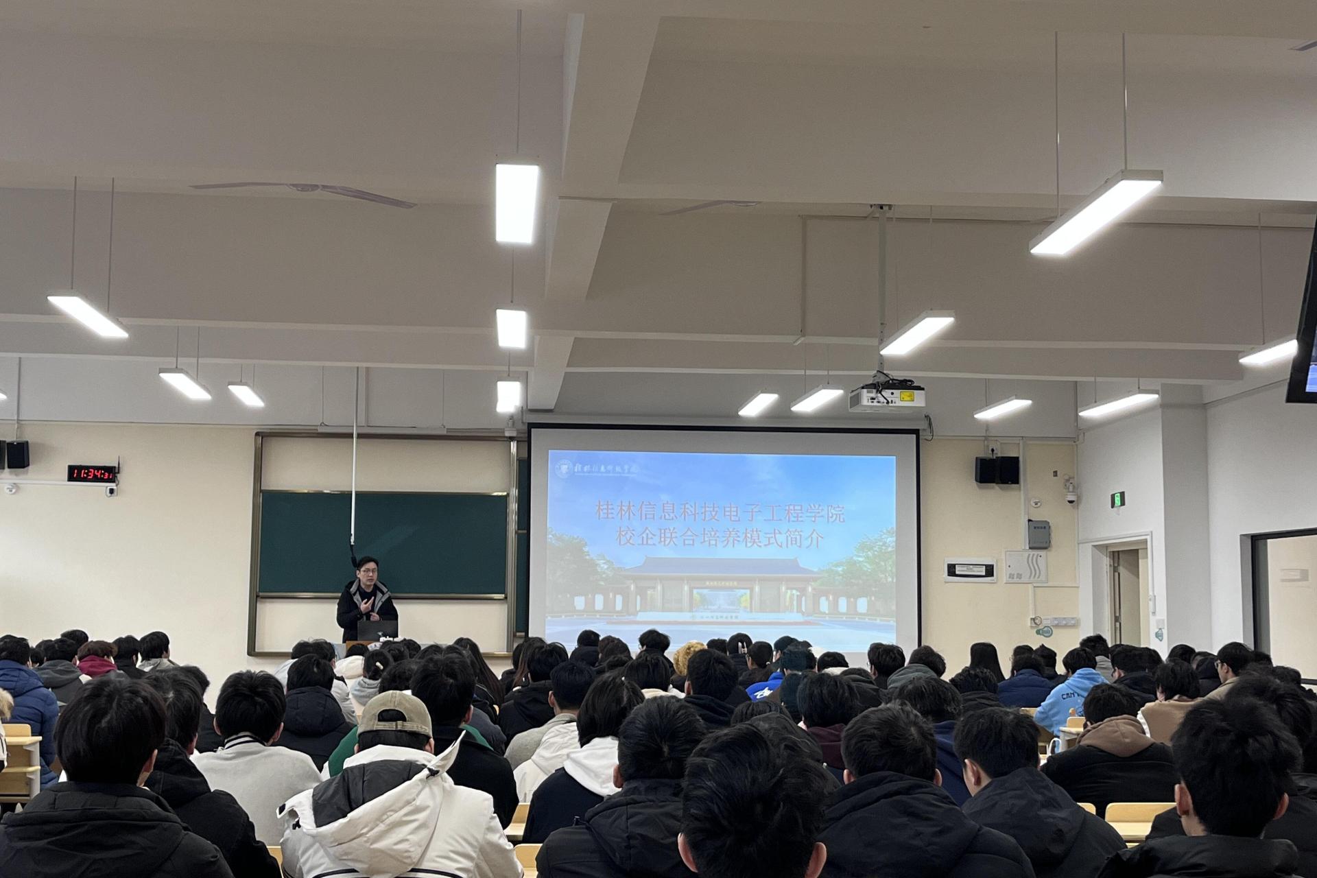 近日,电子工程学院于 C309、D308、D107三间教室,面向2022 级学生开展校企联合培养模式宣讲会,为学生职业发展助力。本次宣讲会由2022级年级主任陈思宇老师主持,院长助理王涛老师主讲。