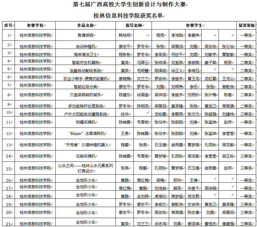 本次大赛全广西区共有19所本科和12所专科院校参加,经大赛专家组审核后有445支参赛队获得决赛资格,其中机械制作类58件、机电结合类111件、创意设计类183件和全地形小车93件,共评出一等奖44个,二等奖68个,三等奖112个,优秀组织奖6个,优秀指导教师40个。