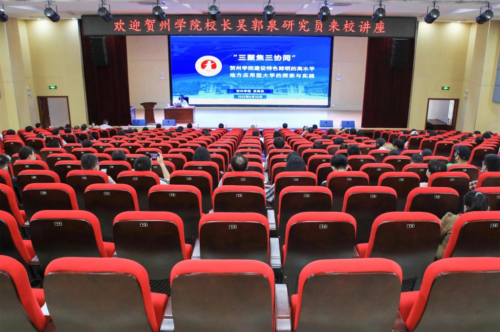 讲座中,吴郭泉校长结合自身长期从事高等教育管理及对应用型大学研究的体会,围绕“贺州学院的发展建设情况”、“对应用型大学的基本认识”、“高等教育面临的机遇和挑战”和“应用型大学建设的体会和思考”四个方面内容,深入阐述了应用型高校的特点、发展轨迹及建设思路等内容。吴校长指出,要全力建设神形兼备的应用型大学,做好“形似、神似和神形兼备”三个发展阶段,抢抓“危机中育新机,与变局中开新局”的发展机遇,推进“人才培养合力、内生发展动力、创新创业能力”和“产教融合协调育人、校地融合协同创新、专创融合协同发展”的“三聚焦三融合”发展模式,努力为适应地方和区域经济社会发展培养高素质应用型人才。