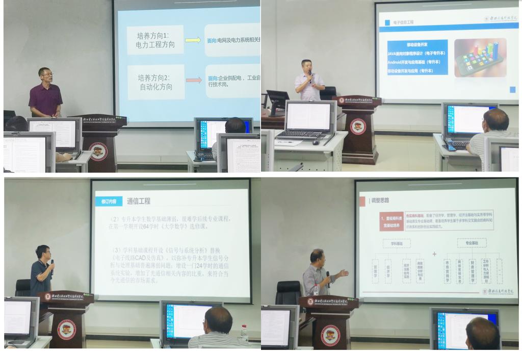 会上,各学院负责人就本学院专升本培养方案制订的前期调研情况、总体设计思路、课程体系设置依据、因材施教思想的体现等进行了总体概述,并分专业对每个专业的专升本人才培养方案课程设置情况进行了详细阐述。
