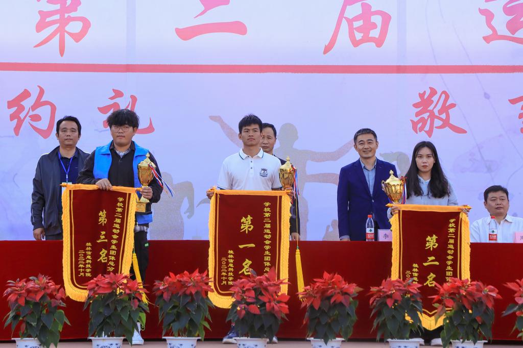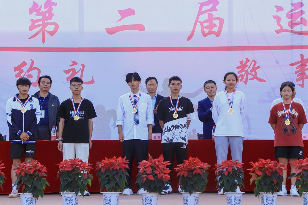运动会期间,学校在田径场内设置了颁奖台,学校领导和相关单位负责人为获奖师生颁授奖牌并合影留念。