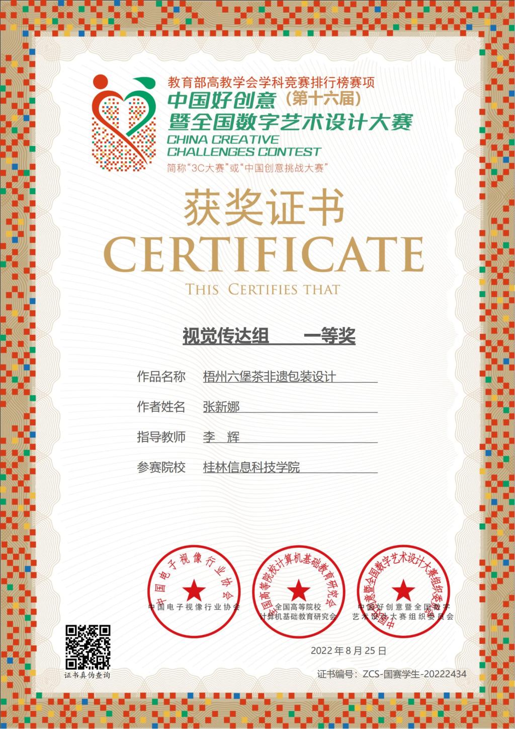 近日,第十六届中国好创意暨全国数字艺术设计大赛获奖结果公布,我校在本次竞赛中荣获全国一等奖2项,三等奖4项的佳绩。我校创意设计学院李辉老师指导陈晨、张新娜两位学生,完成的设计作品《梧州六堡茶非遗包装设计》荣获视觉传达组国赛一等奖2项。