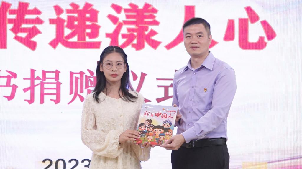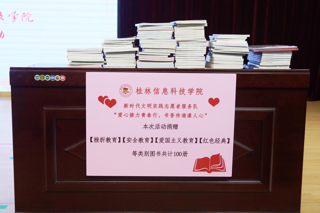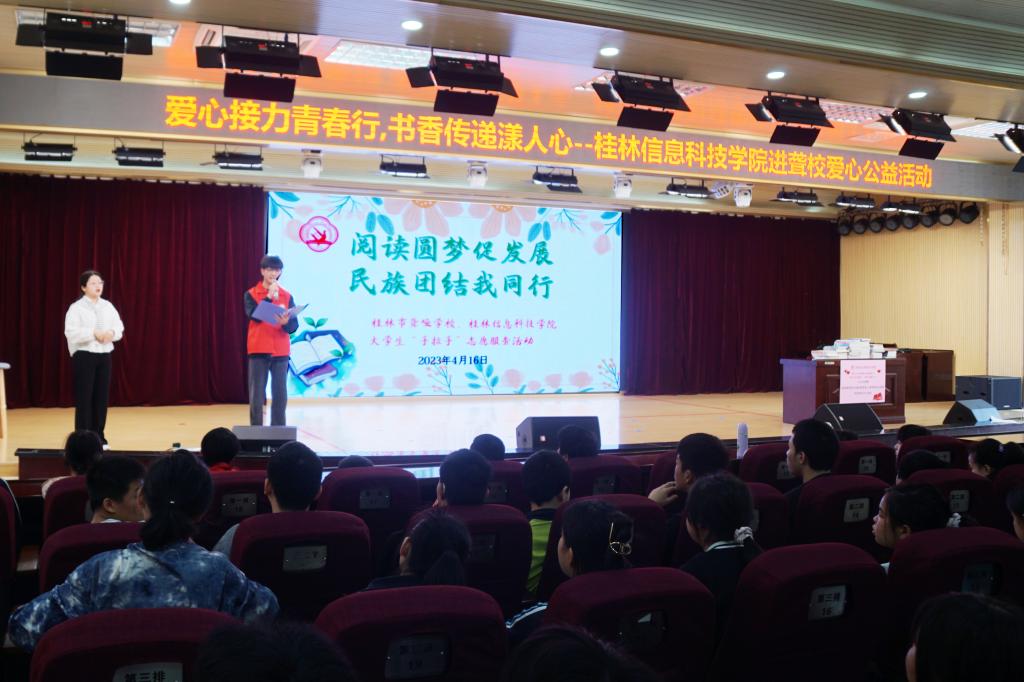 捐赠仪式现场,志愿服务队的学生代表依次上台向小朋友们进行了图书的阅读心得分享。桂林市聋哑学校教师代表莫春燕接受了图书捐赠,并对我校给予的支持表示感谢。