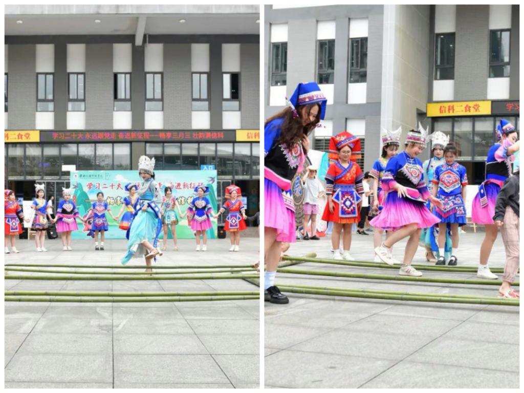 活动期间,同学们通过“民族服装体验”、“民族美食体验”、“民族手工工艺体验”等体验活动,感受民族文化的独特魅力,同时在“方言猜猜看”、“抛绣球”、“跳竹竿舞”等丰富多彩的游戏过程中,赢得各种富有民族特色的精美礼品。此外,现场的民族才艺展示和山歌对唱表演,也尽显民族传统文化的风采,洋溢着浓浓的壮乡文化和青春气息。