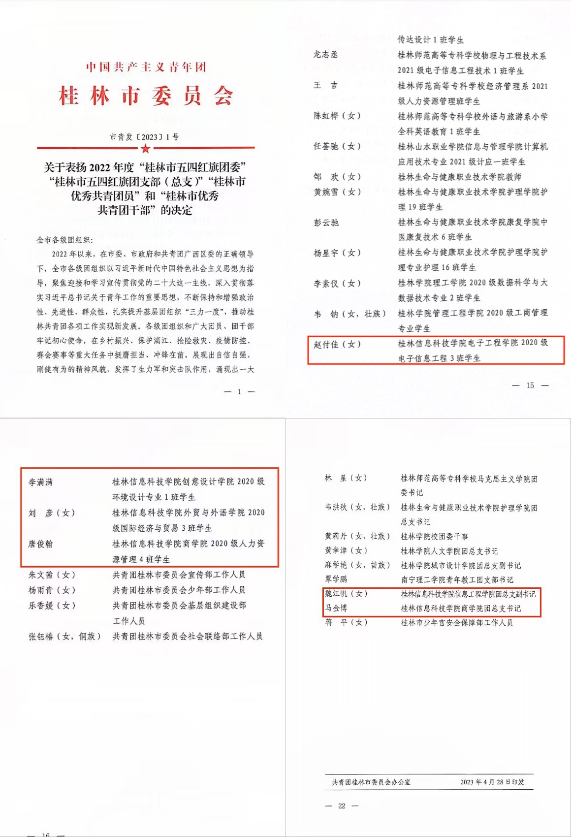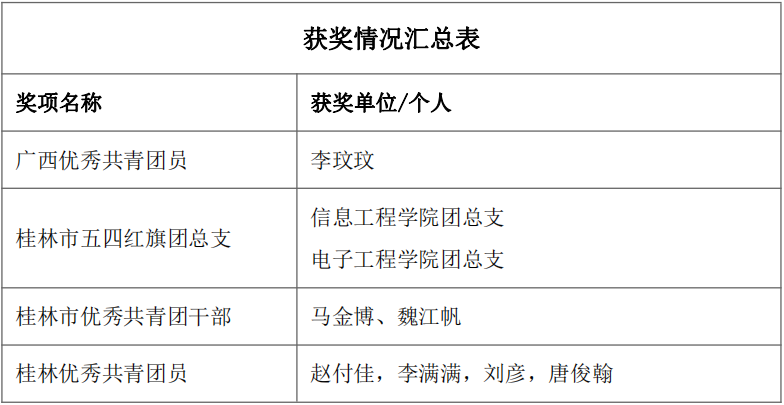 近日,共青团广西区委、共青团桂林市委相继印发了《共青团广西区委 广西青年联合会关于表彰广西共青团先进集体和先进个人的决定》、《关于表扬2022年度“桂林市五四红旗团委”“桂林市五四红旗团支部(总支)”“桂林市优秀共青团员”和“桂林市优秀共青团干部”的决定》,我校共计2个集体、7名个人光荣上榜。