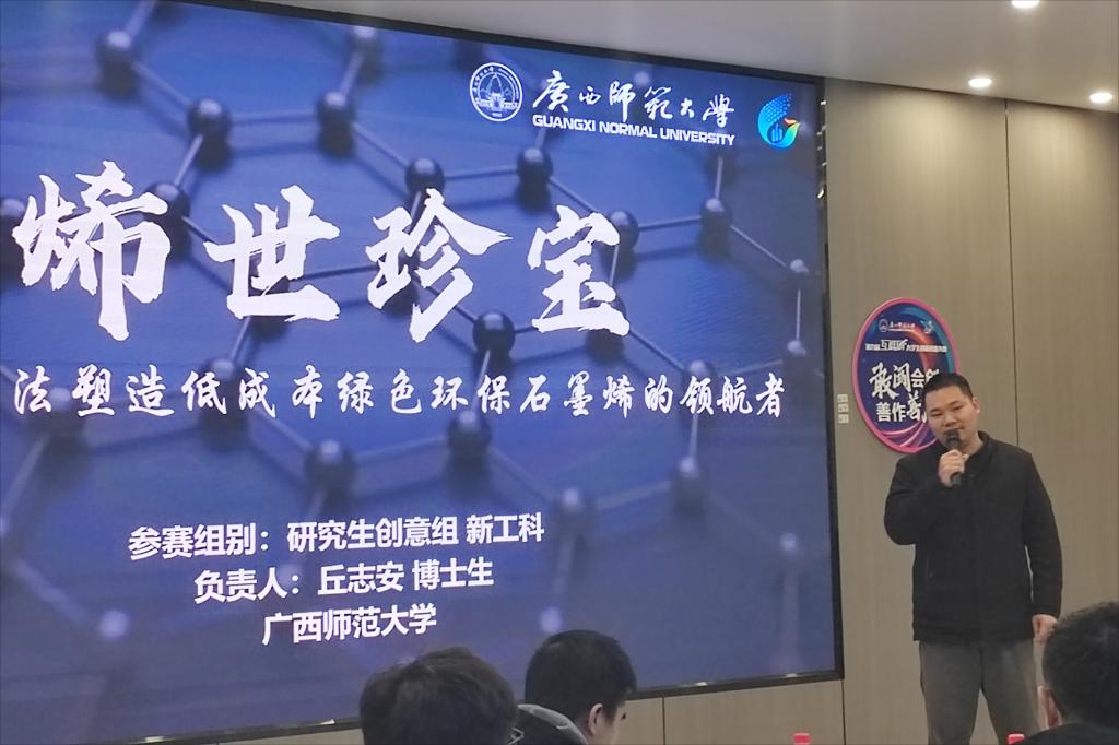 第三讲是由广西师范大学丘志安博士分享他在创新创业项目《烯世珍宝——低成本绿色环保石墨烯的领航者》中的经验心得。丘志安博士围绕项目的核心技术和产品优势,讲述团队在项目实施阶段所遇到的问题以及解决方法,通过深度讲述创新创业项目的孵化过程,为在场师生提供宝贵的经验和启发。