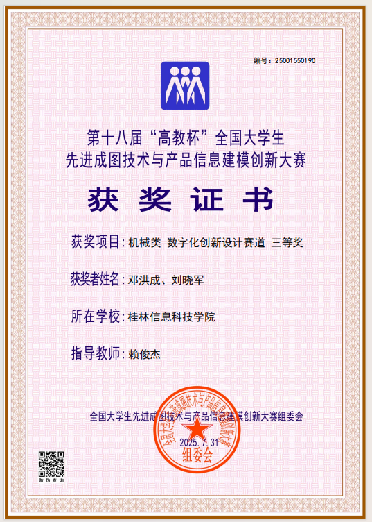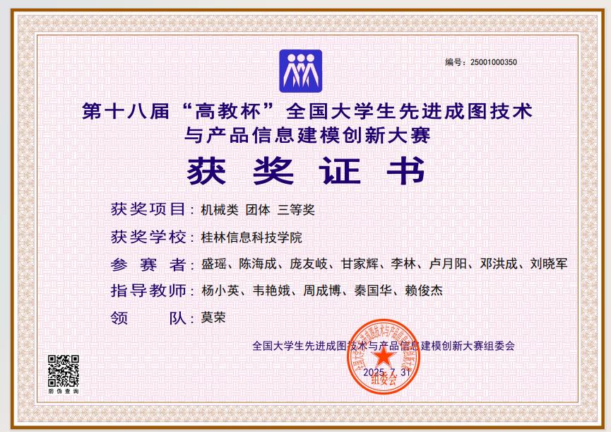 在本届大赛中,我校机电工程学院牵头组织参赛工作,院长助理莫荣担任领队,机械设计制造及其自动化教研室主任、银龄教师王丽娟教授统筹规划,为选手提供全流程专业指导与资源保障。参赛团队展现出深厚的工程图学功底、精湛的建模技艺及突出的创新思维,最终荣获机械类团体全国三等奖1项,先进成图技术赛道、数字化创新设计赛道全国三等奖各1项;莫荣、王丽娟等5名指导教师因教学成效显著,获评“优秀指导老师”。