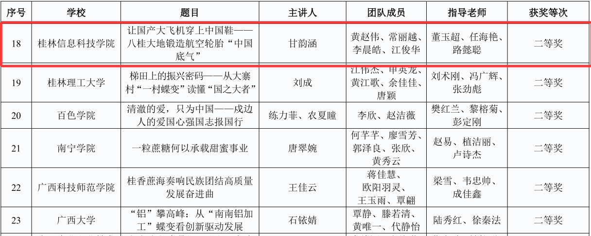 近日,由自治区党委宣传部、自治区党委教育工委、自治区教育厅联合主办的全区高校大学生讲壮美广西“大思政课”推选展示活动圆满落幕。我校师生团队作品《让国产大飞机穿上中国鞋——八桂大地锻造航空轮胎“中国底气”》从全区187项参赛作品中脱颖而出,荣获二等奖。
