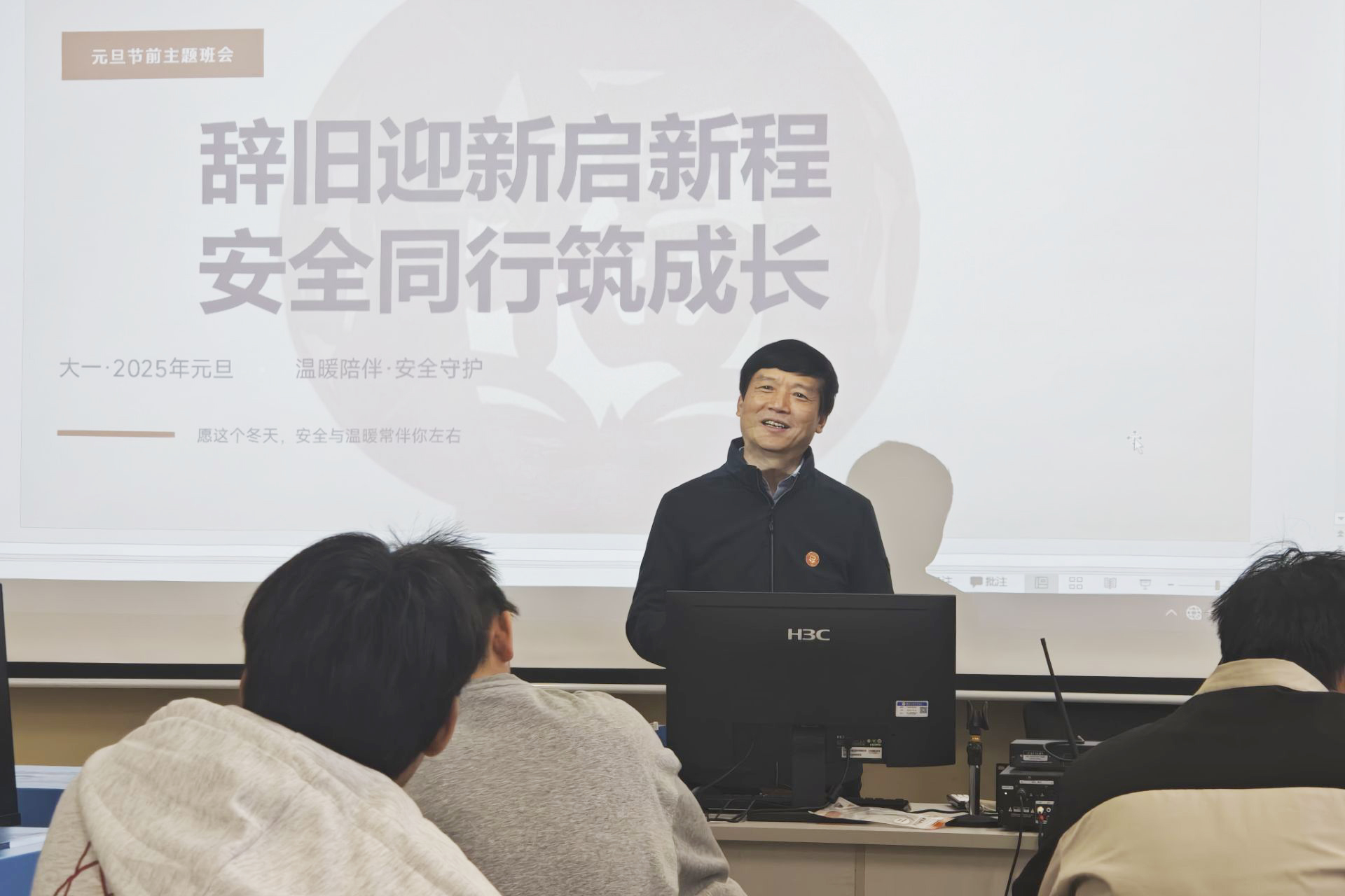 2025年12月31日,我校电子工程学院2025级电子信息工程1班“辞旧迎新启新程,安全同行筑成长”主题班会在敦明楼A212召开。校长解庆林亲临现场,与同学们亲切交流,并送上真挚的新年祝福。班主任许玲老师主持班会。