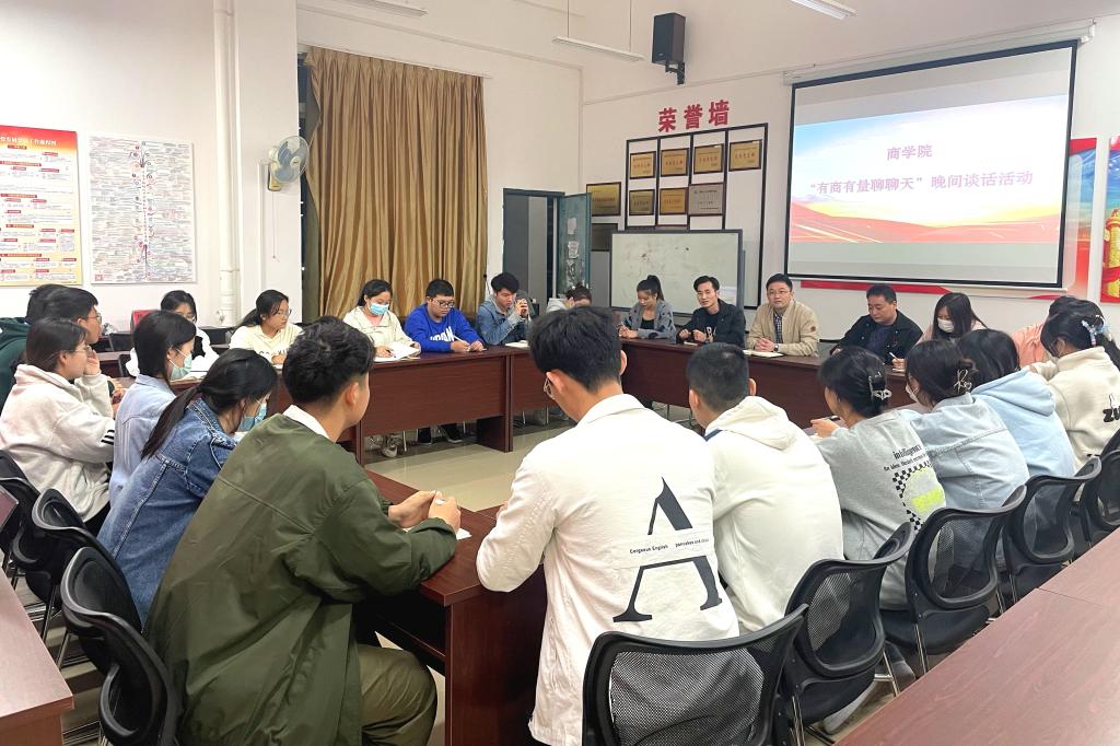 为深入了解学生生活及学习上的痛点难点,发现问题,解决问题,做好服务和引导,做好学生学习和生活的引路人,商学院从本学期开始建立起“有商有量聊聊天”晚间谈话机制。