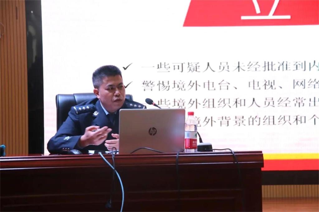 活动中,诸葛明月副大队长从何为国家安全、危害国家安全的行为及相关罪名、如何维护国家安全、谁来保卫国家安全等方面,理论联系实际,从自身角度出发多维度分析案件,向同学们详细的阐述了国家安全法的相关知识。诸葛副大队长将《中华人民共和国国家安全法》的相关法律知识送进校园,给同学们上了一堂生动的法治课,他呼吁同学们作为新时代青年应当担起时代重任,深刻认识到国家安全一切为了人民,一切依靠人民。