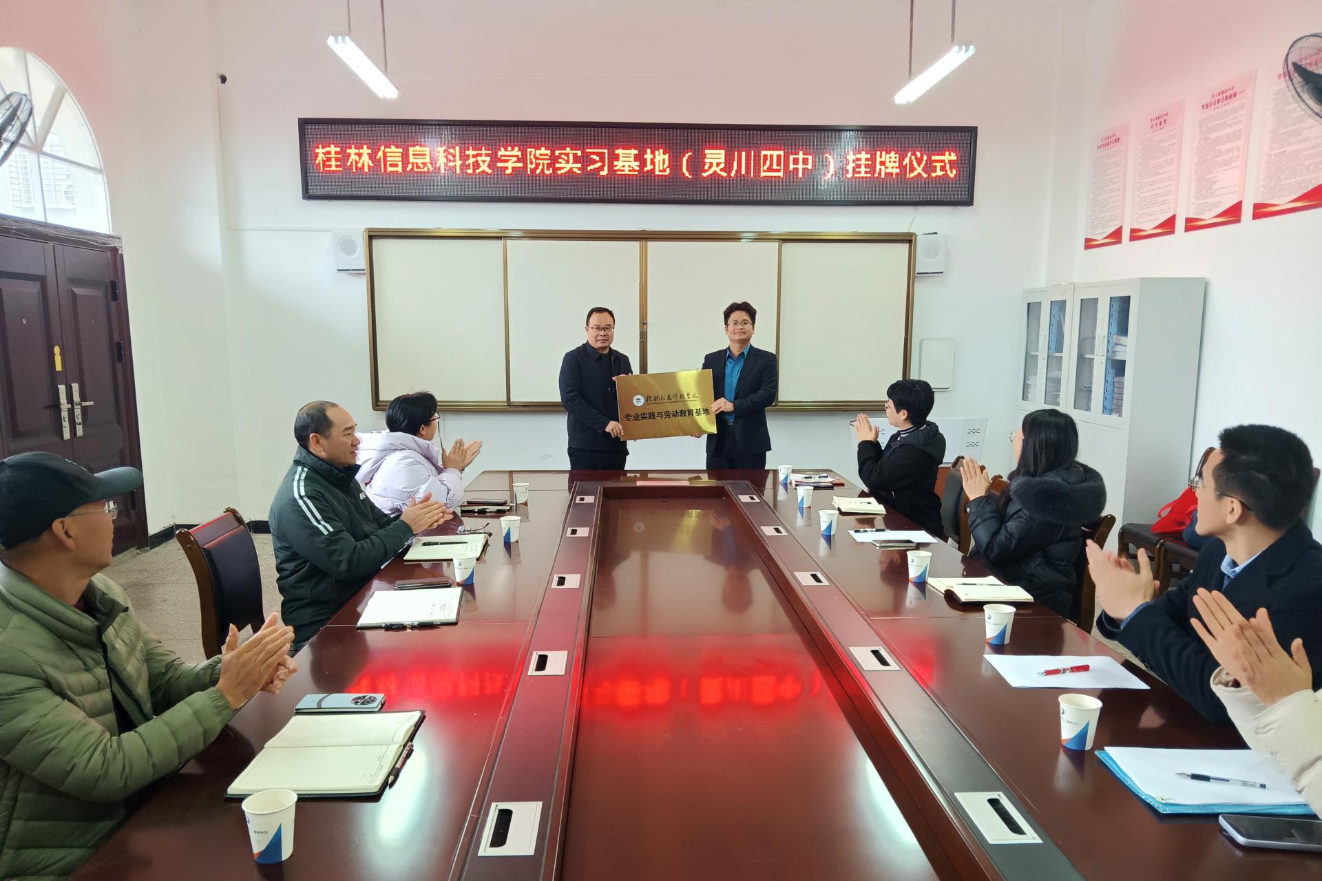交流会上,秦校长首先对我院师生的到来表示欢迎,并对学校的教学质量、生源状况和学校管理等方面进行了详细的介绍,同时,对与我院共建实习基地,共同促进学生专业技能的提升理念予以肯定。赖安副院长也对灵川第四中学给学生提供实习机会和大力培养表示感谢,对学生取得的进步表示欣慰和由衷的高兴,并希望与灵川第四中学建立长效合作机制,加强沟通、交流,实现校校双赢。会后,双方举行“桂林信息科技学院专业实践与劳动教育基地”挂牌仪式。