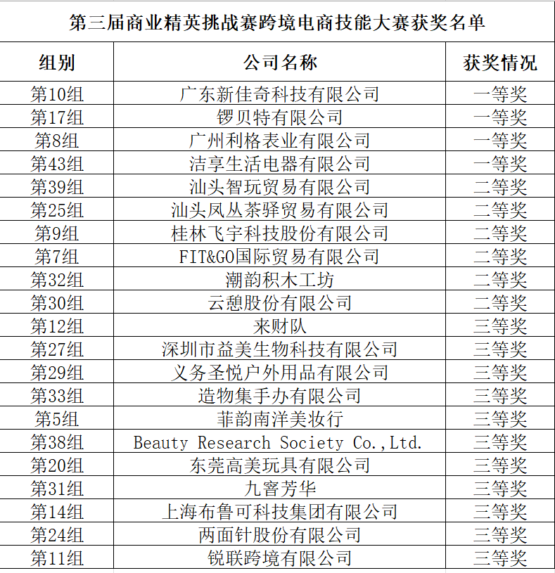 6月19日,我校第三届商业精英挑战赛跨境电商技能大赛圆满落幕。本次大赛有43支团队报名参加,各参赛队以企业(模拟出口商)名义参赛,竞赛内容包括选品策划方案和全英文形式的跨境电商新媒体直播。本次评委由外贸与外语学院多位专任教师担任,全方位为参赛选手进行评判。经过激烈角逐,比赛最终产生了4个一等奖,6个二等奖,11个三等奖。具体获奖名单如下图所示。