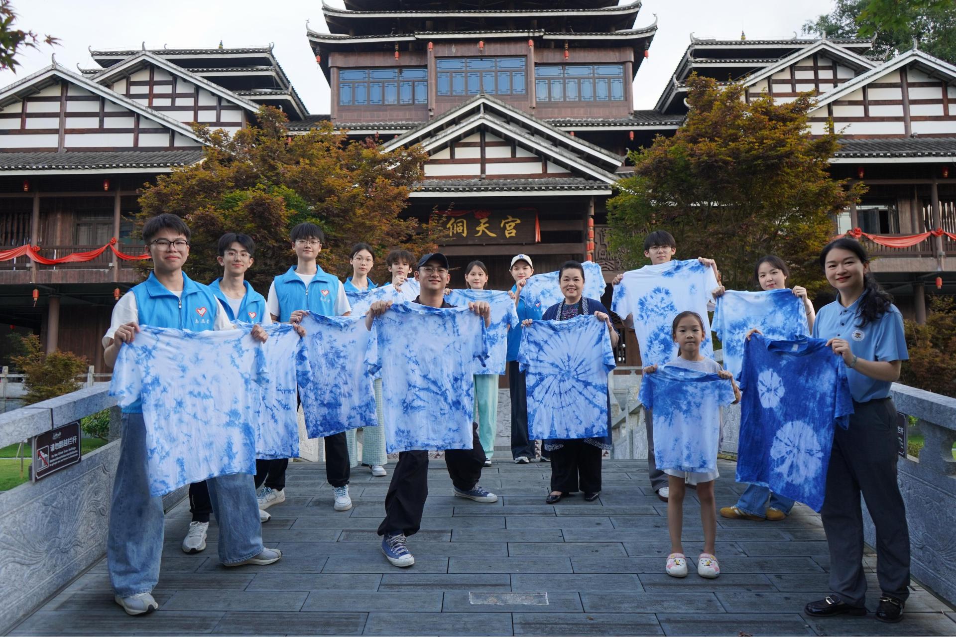 三、传承非遗薪火,文化浸润育自信。特邀侗族农民画(簸箕画)市级项目代表性传承人杨玉洁讲授侗族农民画和扎染技艺,指导志愿者和儿童创作靛蓝纹样作品;深入侗族博物馆、三江鼓楼、宜阳风雨桥开展文化研学,在建筑史诗与织锦技艺中感悟千年侗韵。