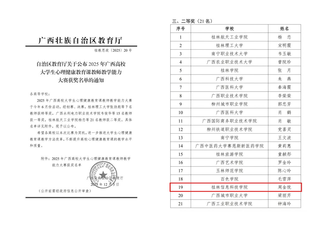 近日,自治区教育厅发布《关于公布2025年广西高校大学生心理健康教育课教师教学能力大赛获奖名单的通知》(桂教思政〔2025〕20号),我校创意设计学院辅导员周金悦在比赛中表现突出,荣获二等奖。