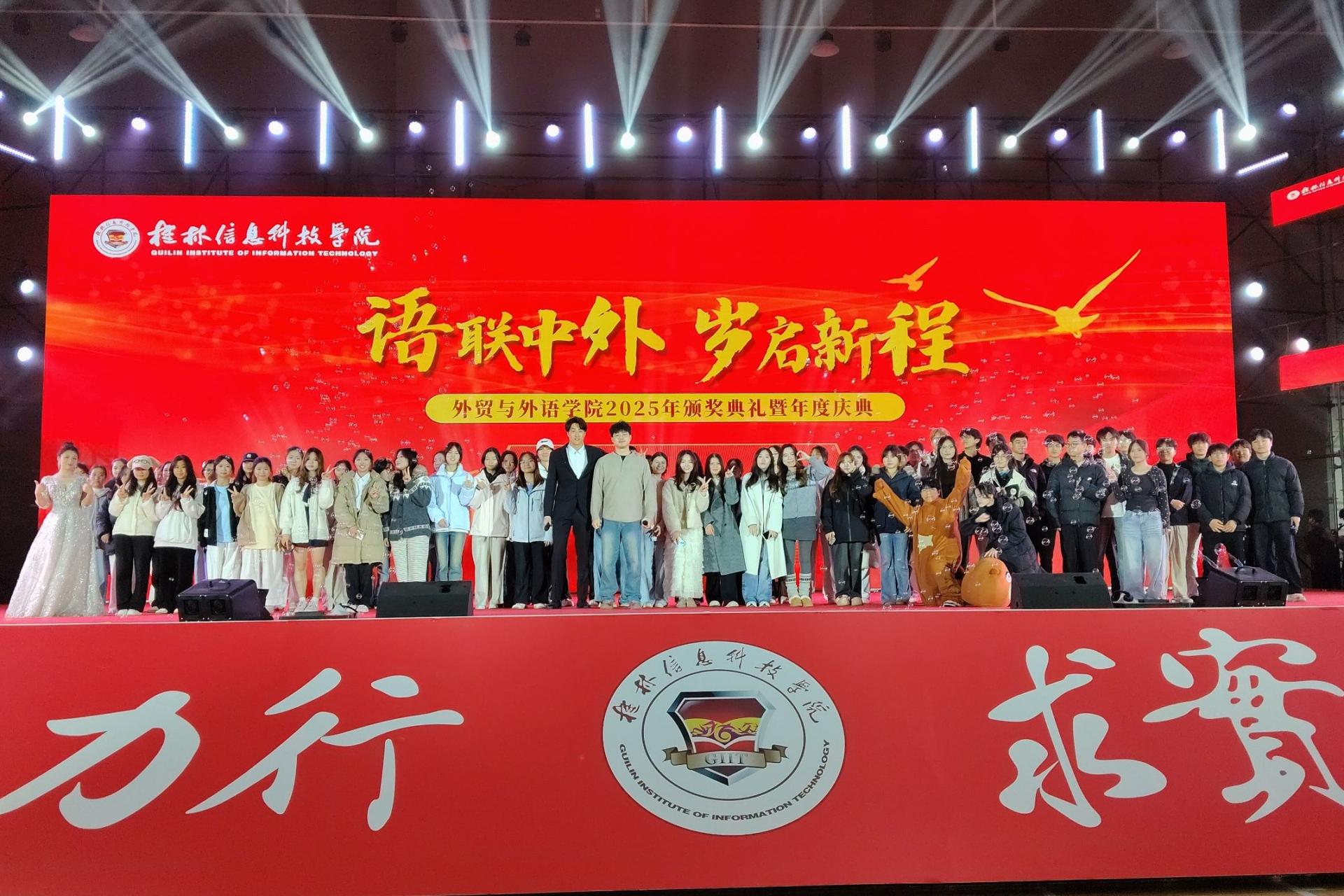12月29日,桂林信息科技学院外贸与外语学院“语联中外,岁启新程”——2025年度晚会暨表彰大会在学校体育馆圆满落幕。学校学生发展与服务中心副主任蒋勇、学院党委书记廖星男、学院副院长赖安、学院党委副书记杨锦超、外贸与外语学院企业专家委员会委员阳朔欧美达英文书院院长欧达、副院长王学清、(英文部)校长阮卫元、人力资源经理雷吉祥、学院各办公室教师代表、历届校友及学院学生400余人齐聚行健楼,以特色文艺展演、重磅荣誉表彰,定格青春盛典,共启新程。