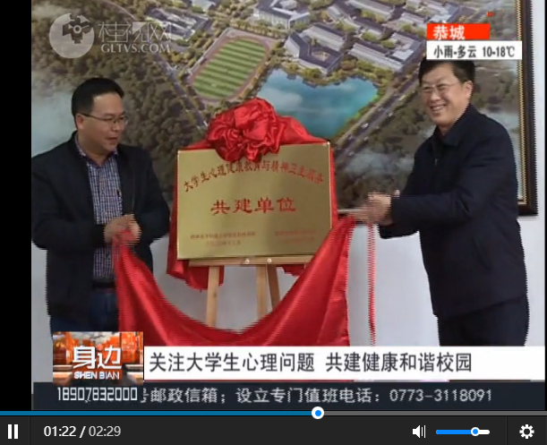 12月22日下午,学院与桂林市精神卫生中心共建心理健康教育与精神卫生服务合作服务站举行合作签约仪式,双方开展合作共建,促进大学生心理健康服务工作。桂林电视台对此进行采访报道。