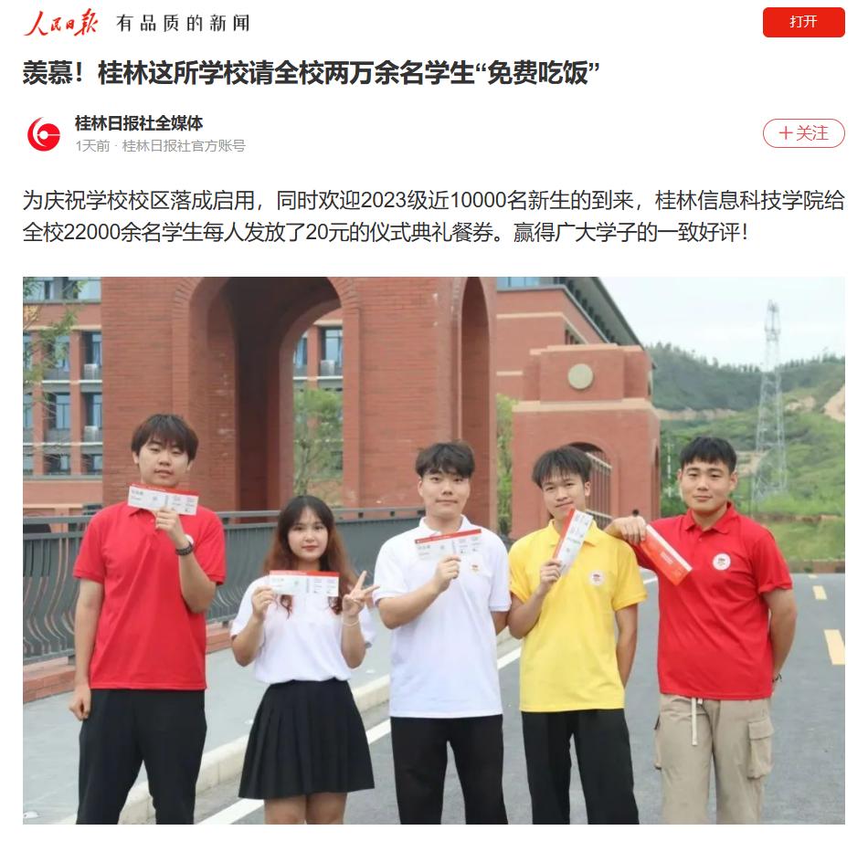 为庆祝学校校区落成启用,同时欢迎2023级近10000名新生的到来,桂林信息科技学院给全校22000余名学生每人发放了20元的仪式典礼餐券。赢得广大学子的一致好评!