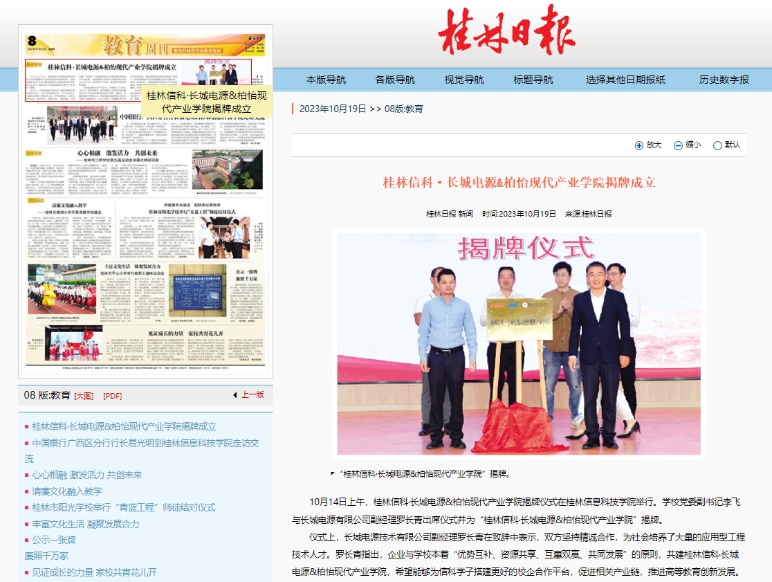 10月14日上午,桂林信科·长城电源&柏怡现代产业学院揭牌仪式在桂林信息科技学院举行。学校党委副书记李飞与长城电源有限公司副经理罗长青出席仪式并为“桂林信科·长城电源&柏怡现代产业学院”揭牌。
