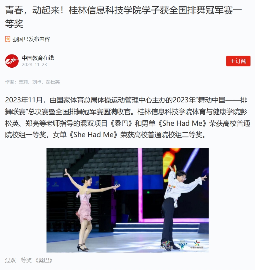 2023年11月,由国家体育总局体操运动管理中心主办的2023年“舞动中国——排舞联赛”总决赛暨全国排舞冠军赛圆满收官。桂林信息科技学院体育与健康学院彭松英、郑亮等老师指导的混双项目《桑巴》和男单《She Had Me》荣获高校普通院校组一等奖,女单《She Had Me》荣获高校普通院校组二等奖。