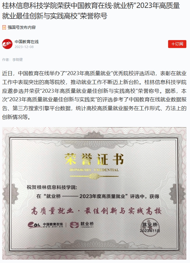 学习强国:桂林信息科技学院荣获中国教育在线·就业桥“2023年高质量就业最佳创新与实践高校”荣誉称号