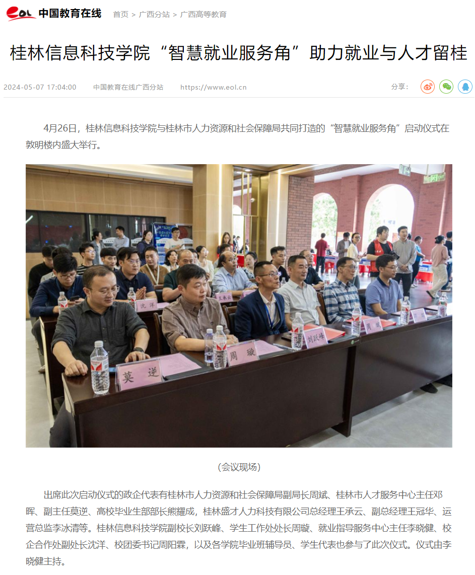 4月26日,桂林信息科技学院与桂林市人力资源和社会保障局共同打造的“智慧就业服务角”启动仪式在敦明楼内盛大举行。